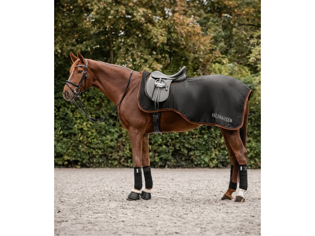 Odolná bederní deka Perth značky Waldhausen v černém provedení nabízí optimální ochranu v chladném a vlhkém počasí. Je vyrobena z materiálu 600 denierů a zateplena výplní o síle 50 g/m². Výřez v oblasti sedla zajišťuje perfektní usazení deky pod anglické sedlo. Reflexní nápisy Waldhausen zlepšují viditelnost při zhoršených světelných podmínkách. Praktické zapínání na suchý zip v oblasti kohoutku umožňuje rychlé nasazení i sejmutí.