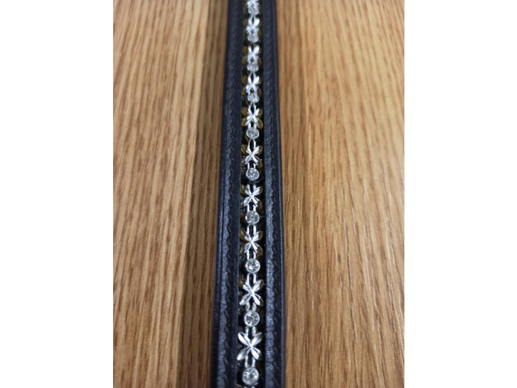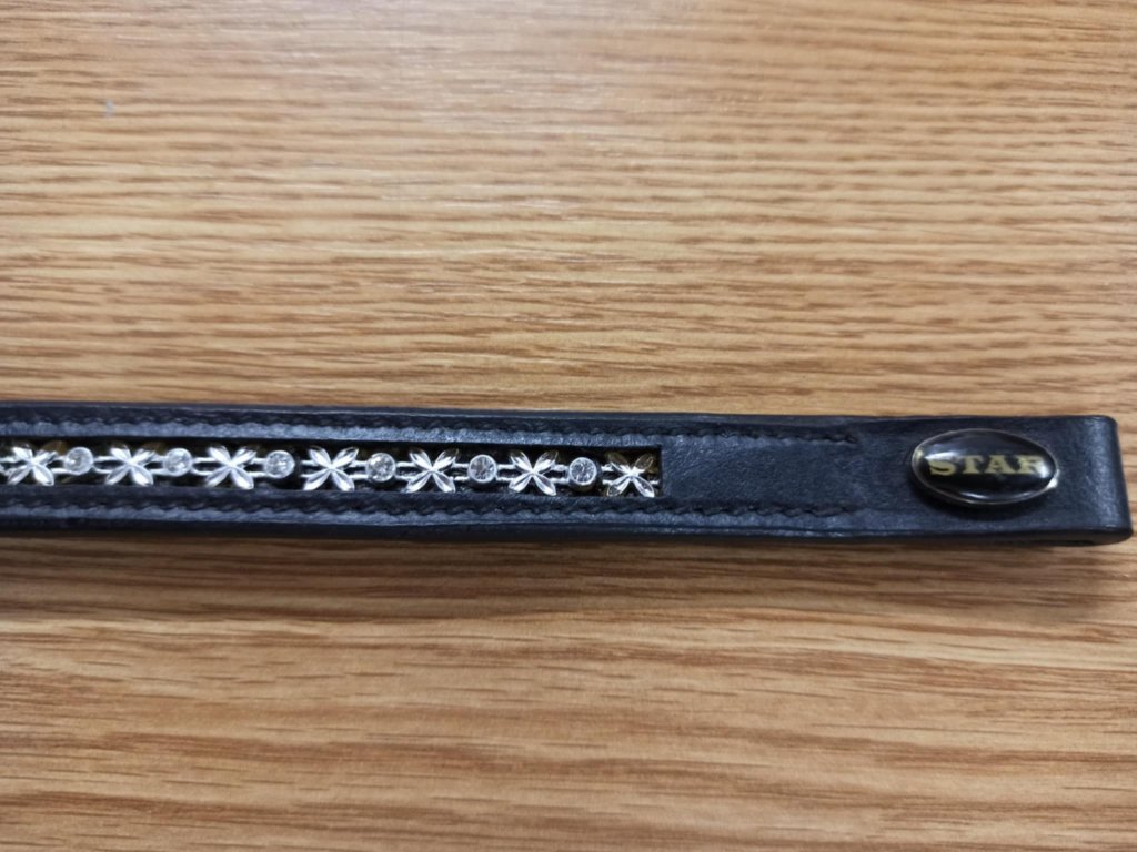 Čelenka FLOWERS Star je navržena pro jezdce, kteří hledají decentní a zároveň atraktivní doplněk pro svého koně. Černé kožené provedení doplňují jemně zdobené stříbrné kamínky v květinovém vzoru, které dodávají uzdě elegantní vzhled. Čelenka je nejen ozdobou, ale i praktickým a kvalitním prvkem uzdečky.