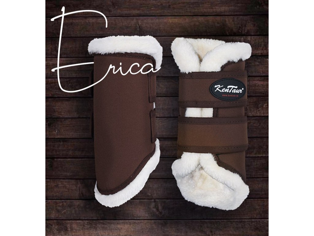 Erika přední chrániče od značky Kentaur jsou navrženy pro každodenní využití – ať už ve stáji, při lehké práci nebo tréninku. Vnější vrstvu tvoří pevný a nepromokavý materiál Kortexim, který odolá mechanickému opotřebení. Vnitřní výstelka z umělého beránku zajišťuje tlumení nárazů a příjemný kontakt s nohou koně, zatímco ochranná EVA vložka navyšuje bezpečnost pěchotní části. Díky širokému suchému zipu se chrániče snadno nasazují a přizpůsobují. Dodávají se v elegantních barevných kombinacích (hnědá/bílá, hnědá/hnědá, či černá/bílá), velikost Full sedne většině koní.