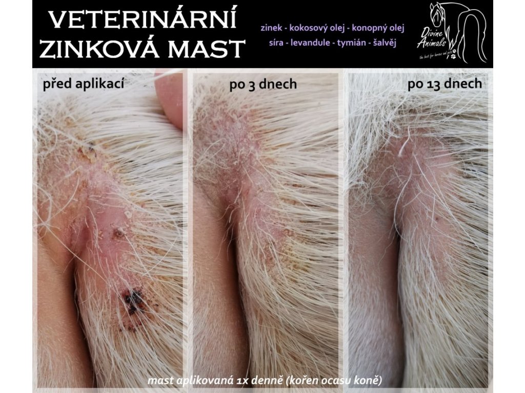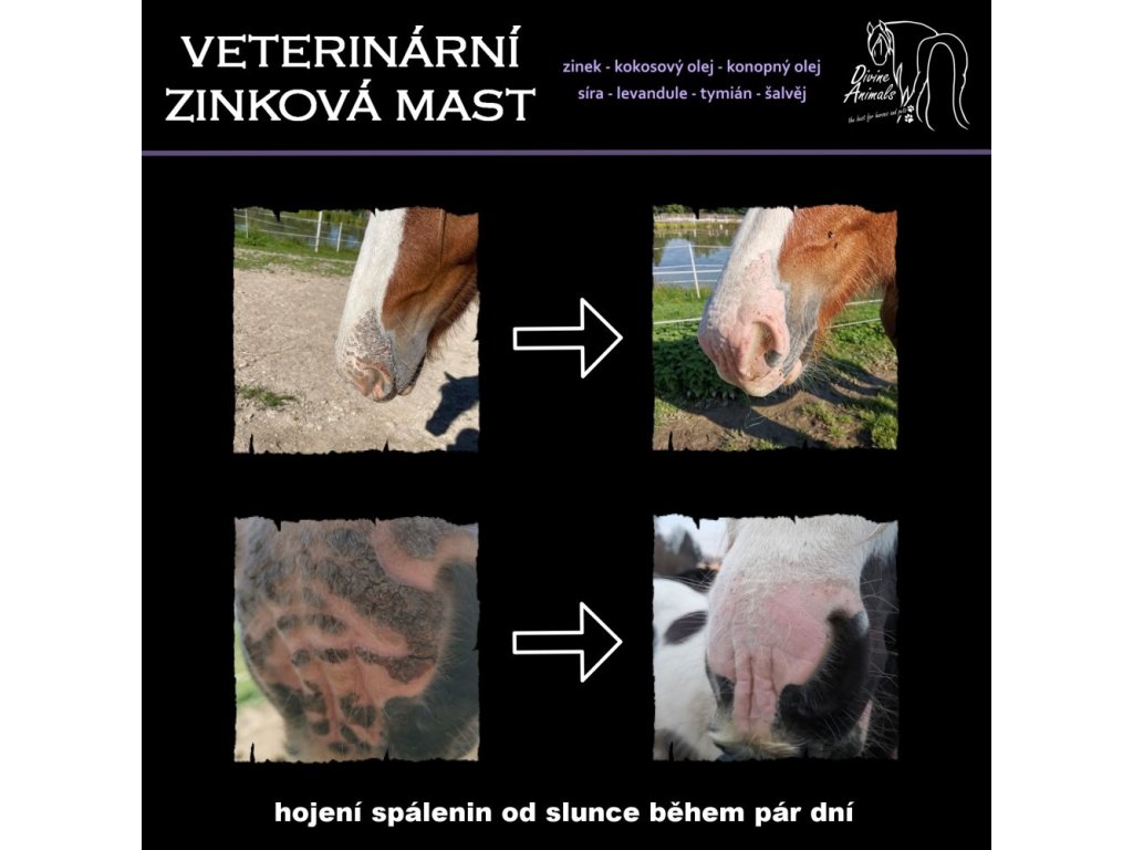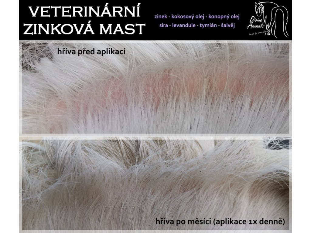 Tato veterinární mast je navržena pro péči o citlivou či narušenou pokožku koní. Obsahuje vysoký podíl zinku, který má antiseptické a protizánětlivé účinky, a pomáhá redukovat zarudnutí, svědění a podráždění. Mast vytváří na kůži ochranný film, který podporuje mikrobiální rovnováhu a přispívá k rychlejšímu hojení ran a oděrek. Díky jemné a nemastné konzistenci se snadno nanáší, dobře vstřebává a umožňuje pohodlnou aplikaci bez zbytečného maštění srsti.