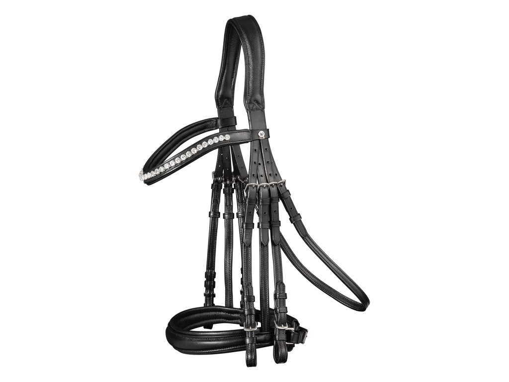 Tato drezurní uzda z kolekce X-Line od značky Waldhausen je navržena s důrazem na kvalitu, pohodlí a eleganci. Vyrobena z mimořádně měkké kůže s anatomicky tvarovanou nánosníkovou částí a elegantní čelenkou zdobenou velkými čirými kamínky. Měkce podšitý nánosník, čelenka i nátylník zajišťují pohodlí pro citlivé oblasti hlavy koně. V balení jsou kožené otěže se šířkou 12 mm, které jsou zakončeny nerezovým kováním. Uzda je ideální pro náročné jezdce, kteří hledají vysoký komfort a profesionální vzhled.