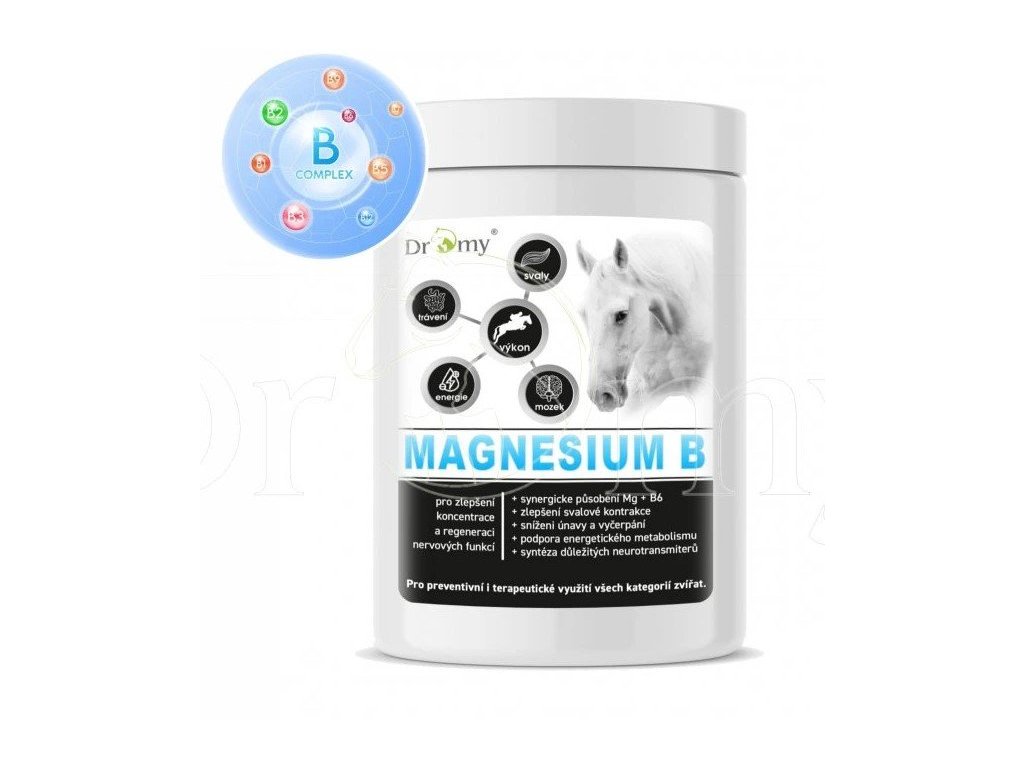 Hořčík je nepostradatelný esenciální minerál, který má v organismu vašeho koně specifické vlastnosti. Prostřednictvím různých klíčových enzymů zasahuje do celkového metabolismu v organismu, přeměny základních živin - bílkovin, tuků a sacharidů a dalších fyziologických procesů - vazomotorický tonus, normální srdeční rytmus, srážení krve, přenos nervových vzruchů, mineralizaci kostí a zubů, aktivní transport iontů vápníku a draslíku přes buněčné membrány. Každá buňka v organismu má nějakou specifickou funkci, na které se hořčík podílí nebo je její součástí. Vitaminy skupiny B jsou vodorozpustné vitaminy. Koně jsou schopni produkovat určité množství těchto vitaminů pro aktuální pokrytí svých potřeb, protože si je nemohou ukládat ve svých tkáních. Přestože velká část produkce vitaminů B závisí na mikroflóře bakterií v zadním střevě, existují různé vnější a vnitřní faktory, které mohou tuto produkci ovlivnit. Kdy využít Magnesium B? U koní všech kategorií s deficitem hořčíku, pro podporu energetického metabolismu, omezení stresových reakcí, snížení únavy a vyčerpání. Sportovní koně, koně s PSSM se sklony ke křečím, ztuhlosti a výskytem svalového třesu a záškubů, se sníženou chutí k jídlu, ztrátou kondice, pro podporu zadního střeva, starší koně se sníženou schopností vstřebávání živin. Synergické působení hořčíku (Mg) a vitaminu B6 je pro koně klíčové. Vitamin B6 zvyšuje absorpci hořčíku v buňkách. Bez dostatečného množství vitaminu B6 je hořčík méně účinně využíván. Svalová kontrakce a relaxace: hořčík je důležitý pro svalovou kontrakci a relaxaci, zatímco vitamin B6 pomáhá tělu hořčík plně využít. Hořčík je nezbytný pro produkci ATP (adenosintrifosfátu), který je hlavním zdrojem energie. Stabilizuje elektrickou aktivitu v nervových buňkách a zajišťuje přenos signálů do svalů. Vitamin B6 je kofaktorem enzymatických reakcí zapojených do tvorby neurotransmiterů a nervových signálů spouštějící svalové kontrakce a relaxace. Energetický metabolismus: oba prvky jsou součástí metabolismu sacharidů, tuků a bílkovin, nezbytných k produkci energie. Vitamin B6 je kofaktorem v mnoha enzymatických reakcích, které hořčík zahrnují. Metabolismus glukózy: hořčík je nezbytný pro správný metabolismus glukózy a produkci ATP, energii ve svalových buňkách, zejména u koní s PSSM, kteří mají problémy s ukládáním a využitím glykogenu. Funkce nervového systému: hořčík a vitamin B6 jsou důležité pro správnou funkci neurotransmiterů jako je serotonin a dopamin, které ovlivňují stresovou reakci, psychiku a kognitivní funkce. Chrání nervový systém proti "předráždění" a zamezují křečím a záškubům. Snížení svalové únavy: pomáhá snižovat akumulaci laktátu ve svalech během fyzické aktivity, snižuje svalovou únavu a bolest. Vitamin B6 podporuje produkci hemoglobinu, který zajišťuje přenos kyslíku do svalů, zlepšuje jejich výkon a snižuje únavu. Kardiovaskulární zdraví: hořčík a vitamin B6 přispívají k regulaci krevního tlaku a srdečního rytmu. Vitamin B6 pomáhá při syntéze hemoglobinu a regulaci homocysteinu. Hořčík podporuje uvolňování cév a pomáhá předcházet hypertenzi.
