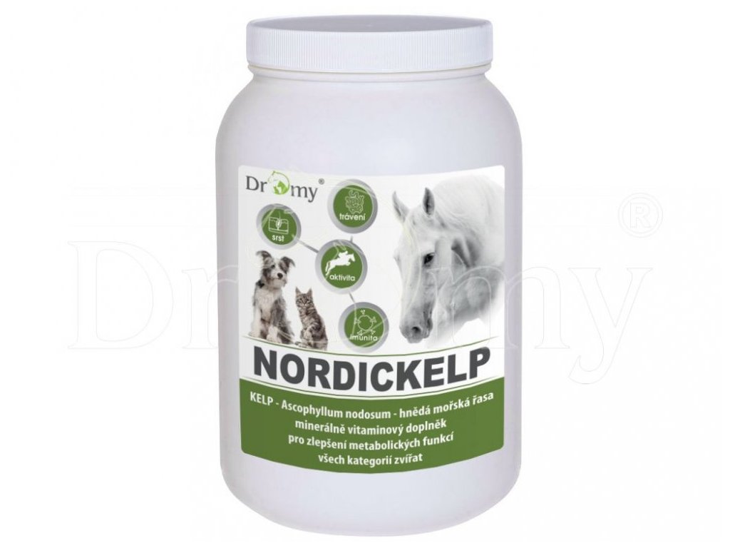 Doplňkové krmivo pro koně s vitaminy a minerály.KELP - ASCOPHYLLUM NODOSUM je oblíbeným a nejprozkoumanějším druhem chaluh,které mají schopnost extrahovat makro i mikroprvky z mořské vody,které následně ukládají ve svých buněčných stěnách.Všechny prvky rozpuštěné v mořské vodě dovedou absorbovat a následně transformovat.Tento proces transformace poskytuje přírodní zdroj vitaminů, organicky vázaných makroprvků a mikroprvků,proteinů, biologicky aktivních látek, jako jsou polynenasycené mastné kyseliny (PUFA) omega-3,polysacharidy, pektiny, karagenan. Zdroj organicky vázaného jódu vhodný u koní, u kterých byla diagnostikována hypofunkce štítné žlázy.Fuxoxanthin - antioxidant podporuje látkovou výměnu a urychluje metabolismus tuků,vhodný pro obézní koně a koně IR, PSSM.Organické mikro a makroprvky s vyšší transportní vstřebatelností a metabolickou využitelností až 90 %. S ohledem na tyto skutečnosti je NORDICKELP, velmi účinným a prospěšným krmným doplňkem,který se výrazně podílí na stimulaci imunitního systému a zlepšení metabolických funkcí.