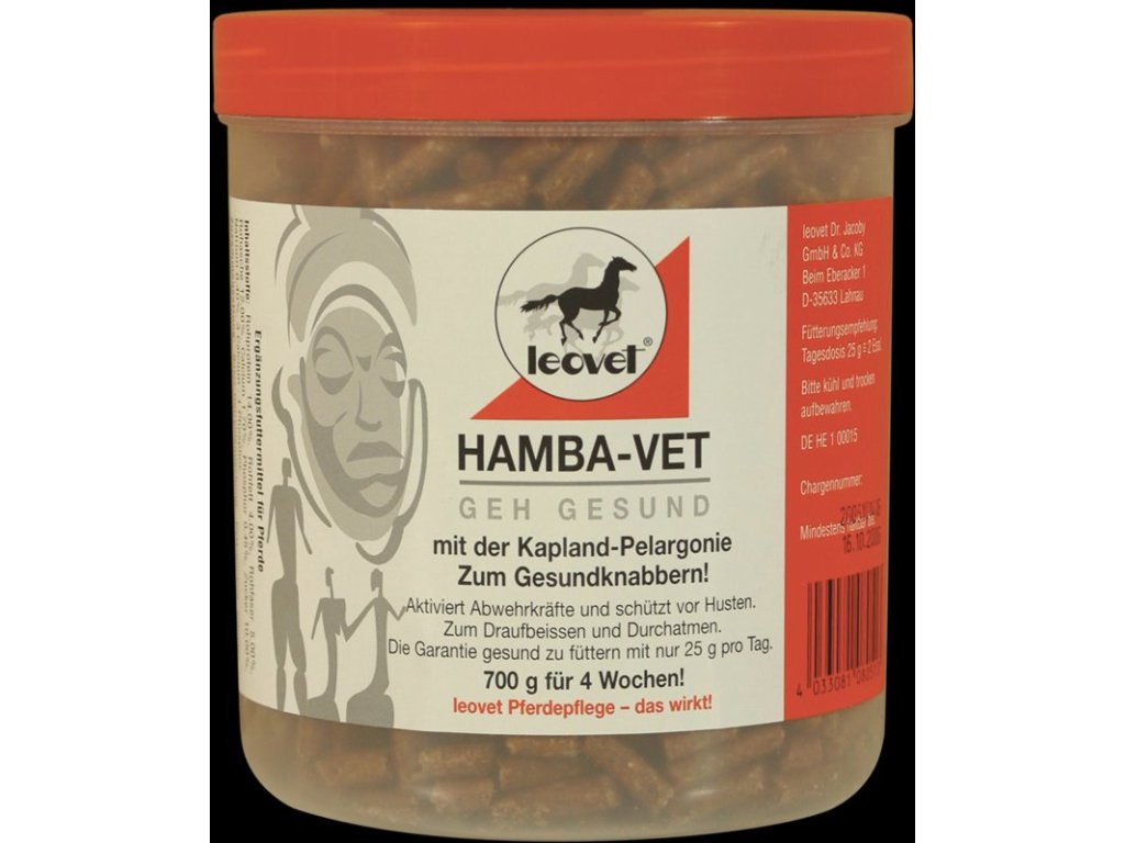 Hamba‑Vet Leovet je bylinný krmný doplněk určený pro koně trpící kašlem nebo náchylné k respiračním potížím. Obsahuje kapskou pelargonii (Cape Pelargonium), široké spektrum bylin – mimo jiné přesličku, kopřivu, podběl, lékořici, jitrocel, tymián, mátu a borové jehlice – které společně uvolňují dýchací cesty, rozkládají hlen, působí proti mikrobiálním infekcím a posilují obranyschopnost. Granulovaná forma se snadno přimíchává do krmné dávky.