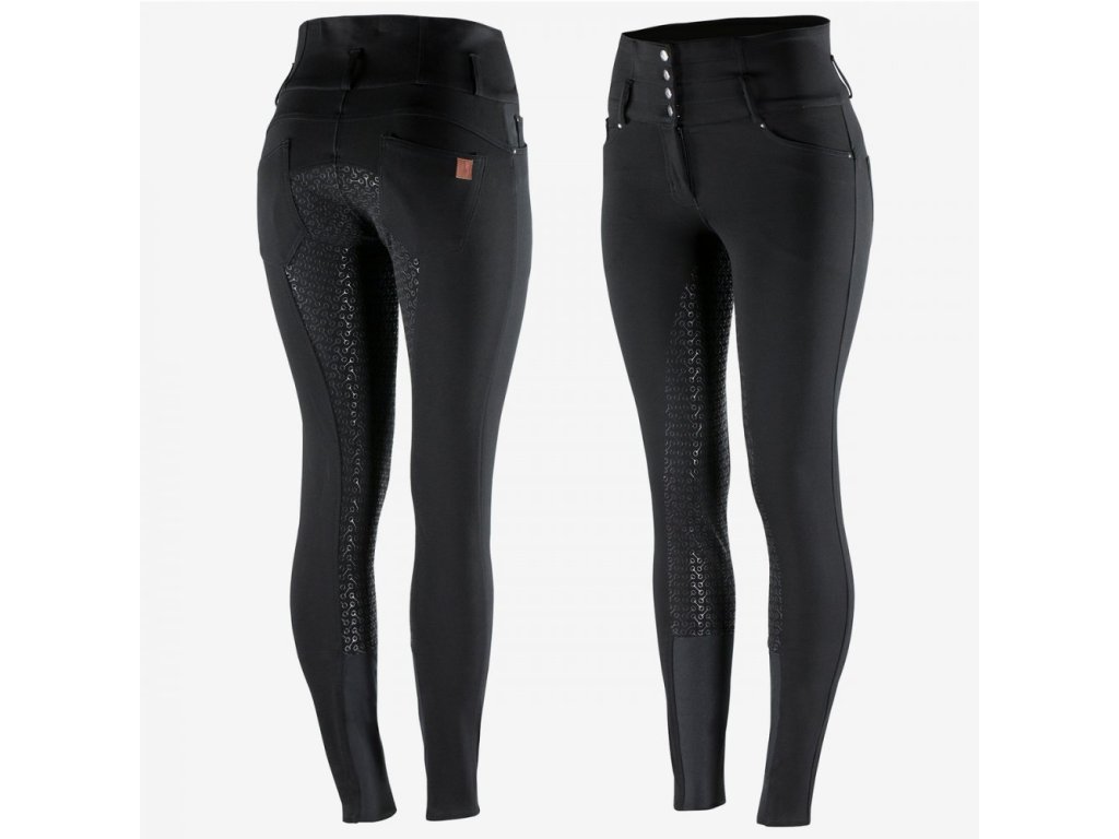 Rajtky HORZE Tara spojují komfort, funkčnost a elegantní design. Jsou vyrobené z elastického a prodyšného materiálu, který dobře sedí a přizpůsobí se postavě. Vysoký pás poskytuje podporu a přispívá k pohodlnému pocitu během nošení. Jemný silikonový sed v dolní části zvyšuje stabilitu v sedle a nabízí dobrý kontakt s koněm. Rajtky mají pevný pas s poutky pro opasek a klasické zapínání na knoflík a zip. Rovné nohavice jsou zakončeny elastickým lemem pro snadné obouvání do jezdeckých bot. Přední kapsy pojmou drobné osobní věci. Design je minimalistický s decentními logy HORZE, což umožňuje variabilní použití – do stáje i volný čas.