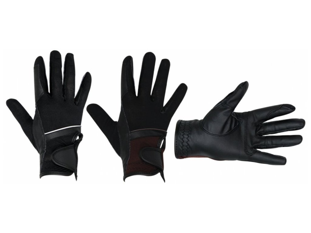 Lehké letní rukavice, s prodyšnou síťovinou na hřbetu ruky, dlaň serino. Barva černá s jemným proužkem z bílé barvy.