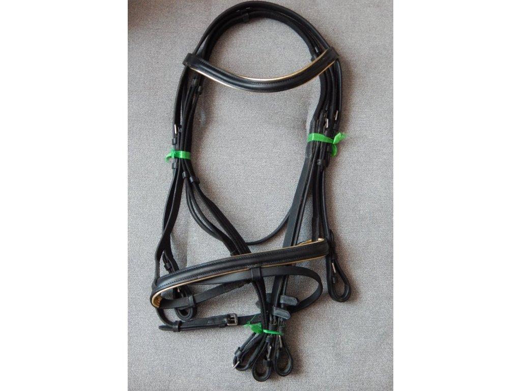 Uzdečka Mámekoně v černém koženém provedení se zlatým podložením spojuje styl, kvalitu a pohodlí. Zlaté podložení dodává slavnostní nádech a zároveň podtrhuje eleganci. Včetně plátěných otěží, které poskytují pevný a jistý úchop. Ideální pro jezdce, kteří chtějí zaujmout na závodech, přehlídkách i při běžném tréninku.