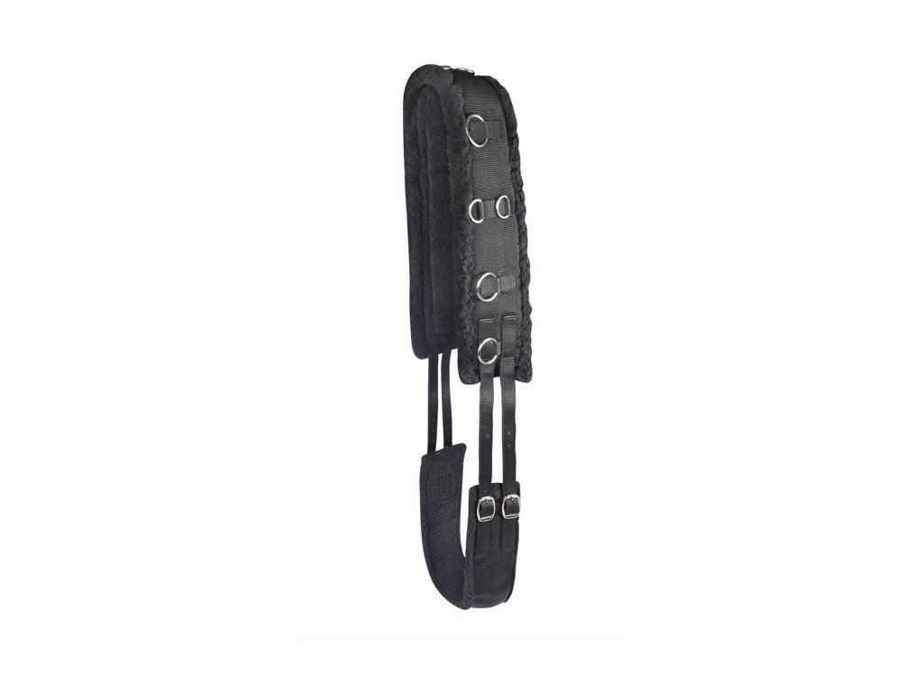 Tento černý lonžovací obřišník poskytuje koni maximální pohodlí díky silnému beránkovému polstrování, které chrání před odřením během tréninku. Je opatřen několika vyvazovacími kroužky, které umožňují různé varianty připnutí pomocných otěží. Díky nastavitelnému podbřišníku je možné obřišník přesně přizpůsobit různým typům koní. Dostupný ve velikostech PONY, COB a FULL.