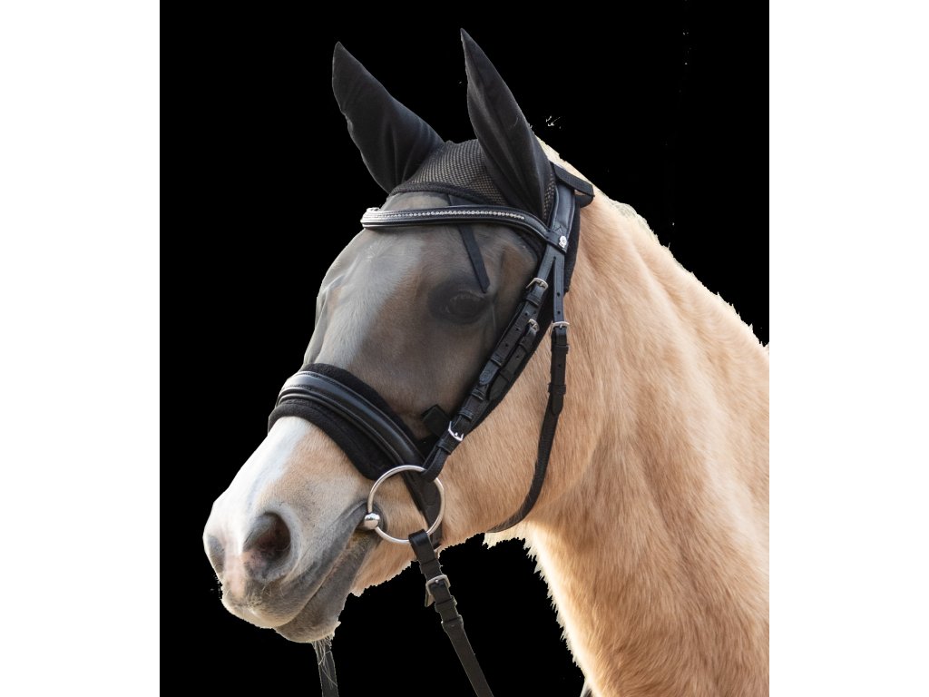 Inovativní maska proti hmyzu pro jízdu na koni. Obzvláště prodyšný materiál na uších poskytuje optimální ochranu proti hmyzu, aniž by se v něm hromadilo teplo.