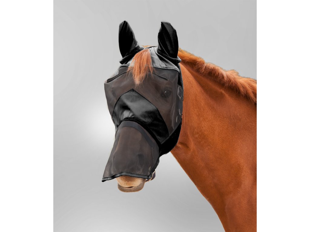 Maska proti hmyzu Premium je ideální pro ochranu koně před mouchami a bodavým hmyzem. Vyrobena z odolného síťového materiálu, který poskytuje dostatečnou ventilaci. Měkké fleecové polstrování v oblasti čela, uší a nosu zabraňuje odírání a zvyšuje komfort. Extra prostor kolem očí zaručuje pohodlné nošení bez tlaku na oko. Pro nos existují dvě možnosti – síťka nebo třásně – podle preference jezdce. Upevnění probíhá pomocí suchého zipu a maska dobře drží tvar díky výztuži u očí.