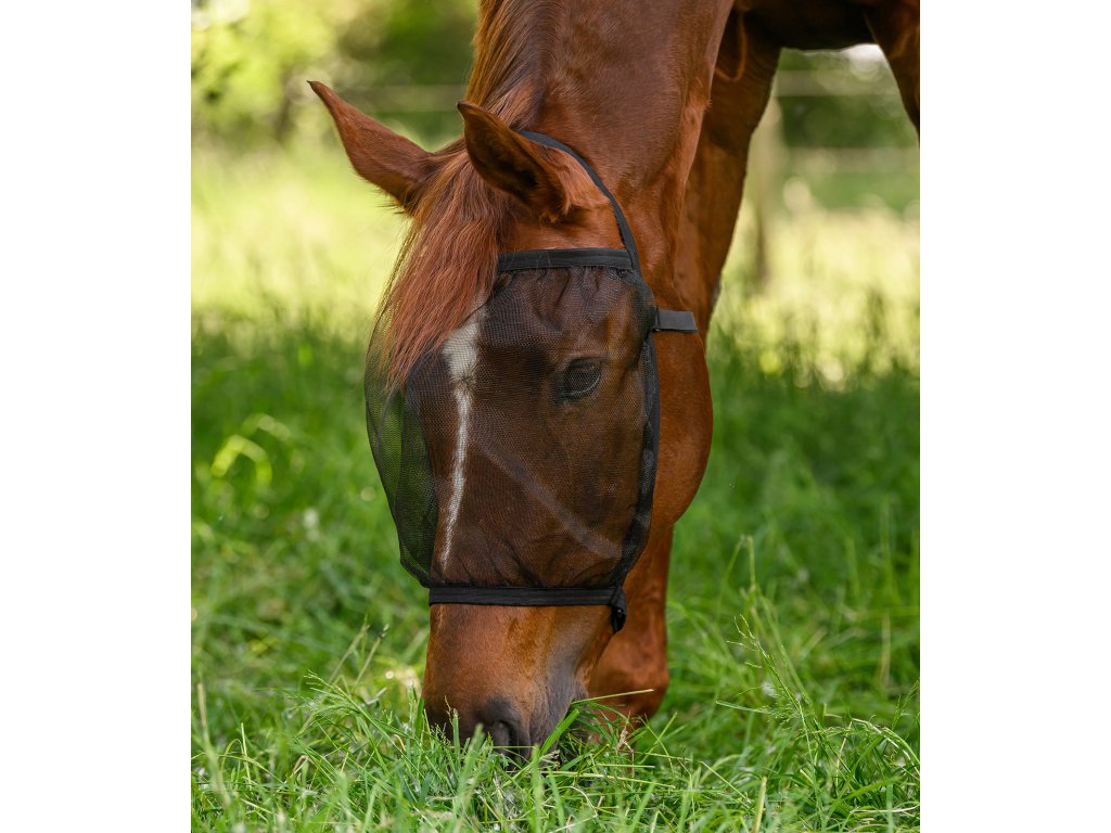 Lehká maska proti mouchám s elastickým lemem, která chrání citlivé oči koně před otravným hmyzem. Jemná, pevná síťovina chrání před drobným hmyzem a poskytuje optimální volnost pro oči. Pásek na krk a nánosník jsou plynule nastavitelné, aby přesně přiléhaly k hlavě koně.