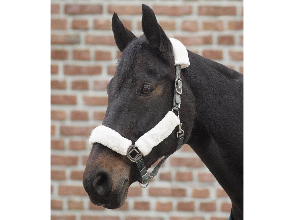 Nylonová ohlávka, polstrovaná umělým beránkem, nastavitelná velikost i kolem nosu, zapínání na přezky.