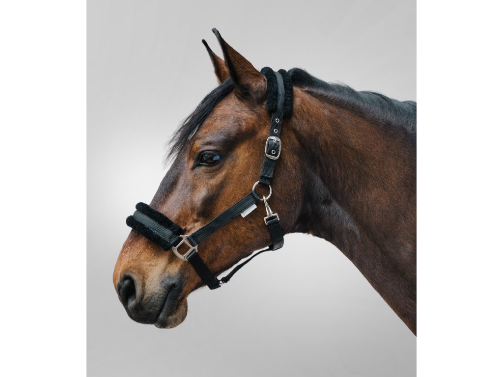 Chlupatá ohlávka s měkkým polstrováním ze syntetické kožešiny na ohlávce a nánosníku.