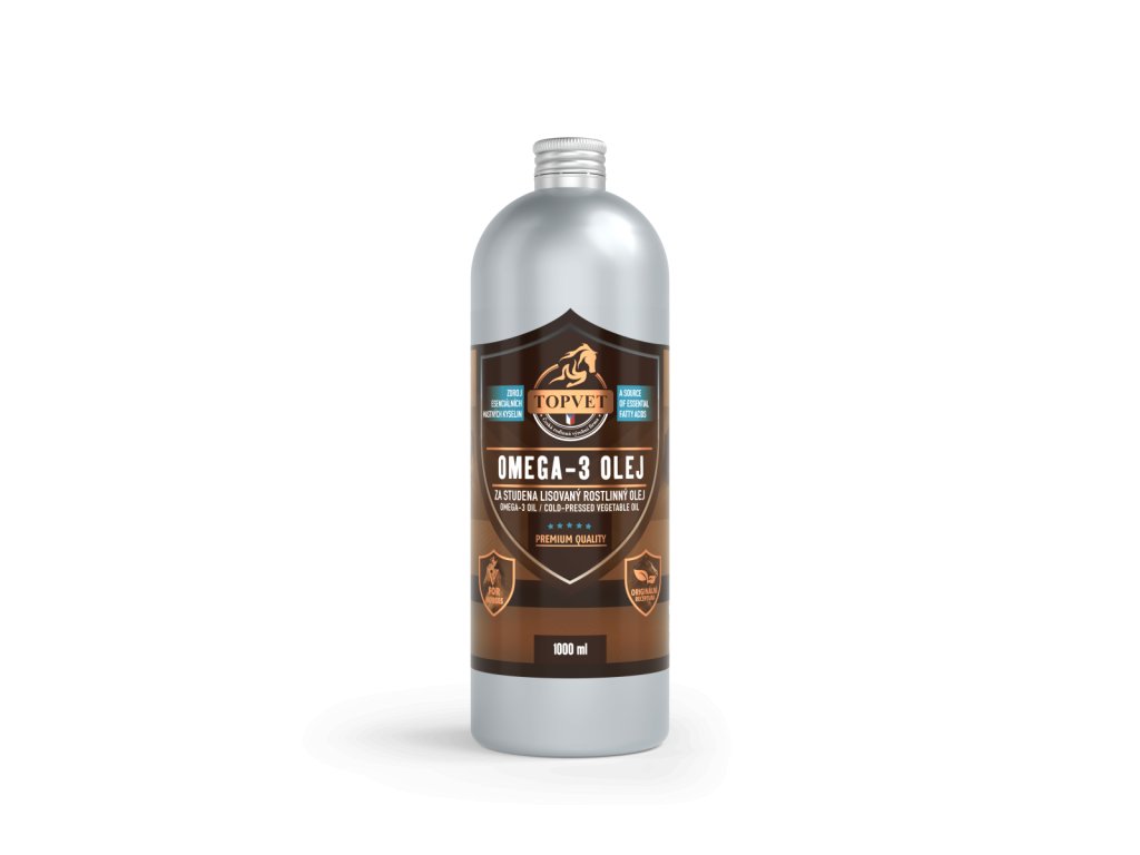 Omega 3 olej TOPVET je kvalitní přírodní doplněk stravy určený pro koně, který obsahuje vyváženou směs rostlinných olejů bohatých na nenasycené mastné kyseliny. Ty přispívají k optimální funkci kardiovaskulárního, nervového, respiračního a trávicího systému. Pravidelné používání oleje zlepšuje kvalitu kopyt, pokožky a srsti, zvyšuje odolnost organismu a podporuje vytrvalost a výkon zvířete. Olej má příjemnou chuť a lze jej jednoduše přidávat do krmiva.