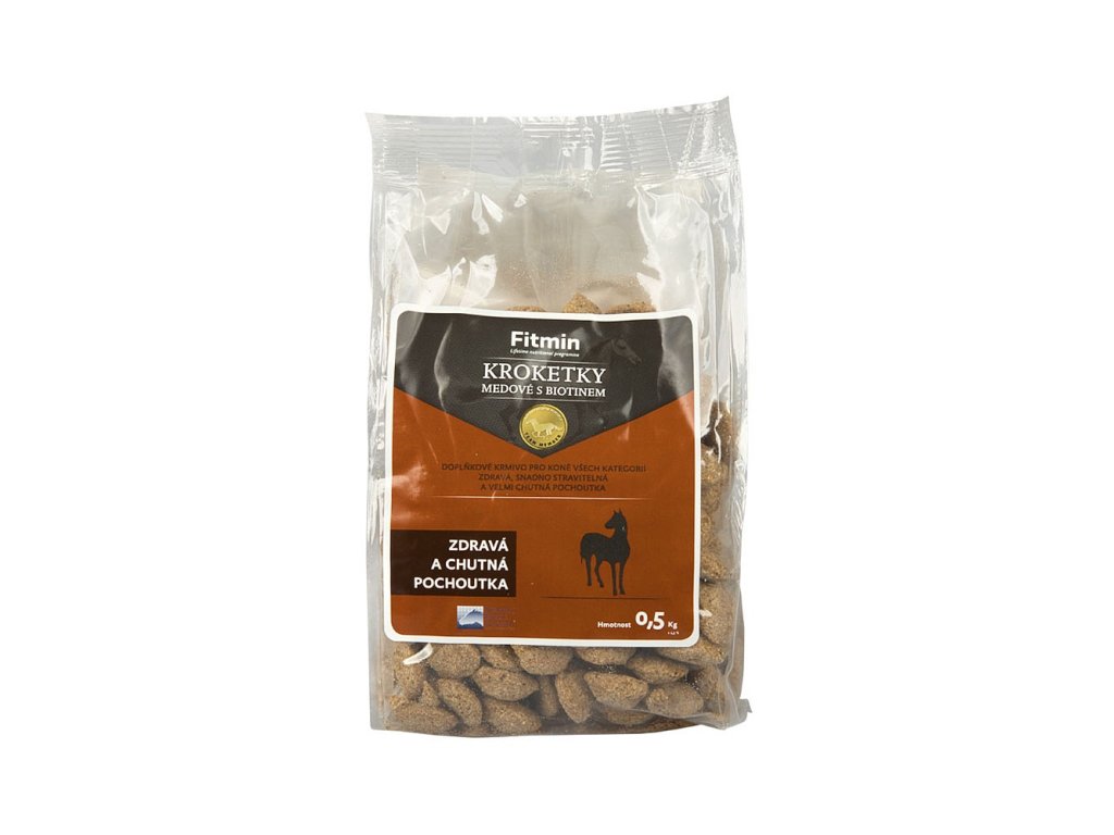 Fitmin krokety s medem a biotinem jsou doplňkové krmivo pro koně, které spojuje výbornou chuť s praktickým přínosem pro zdraví. Díky obsahu medu mají pamlsky přirozeně nasládlou chuť, kterou koně milují, zatímco biotin (vitamin B7) podporuje pevnost kopyt, lesklou srst a zdravou kůži. Tvrdší konzistence pamlsků přispívá k mechanickému čištění zubů při žvýkání. Jsou bez umělých barviv a konzervantů, vhodné pro každodenní použití jako odměna během práce i odpočinku.