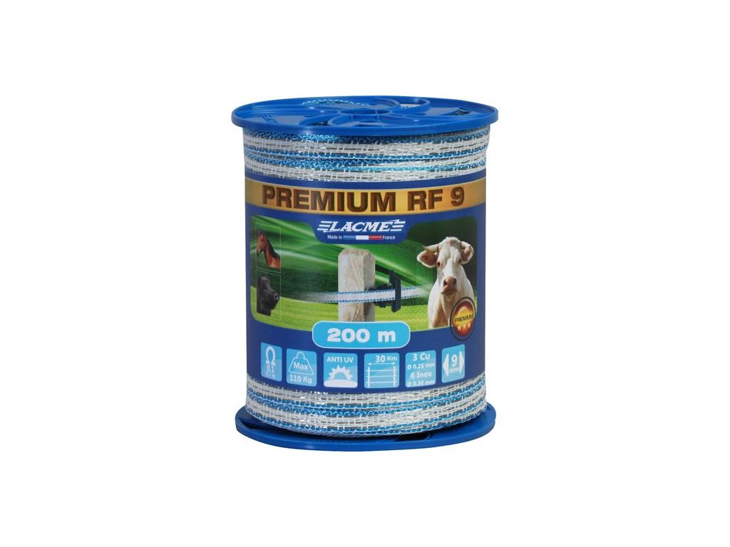 Páska ohradníková Lacme Premium RF 9 je speciálně navržena pro použití v náročných a agresivních podmínkách. Díky šířce 9 mm a délce 200 m je vhodná pro elektrické ohradníky určené k ohrazení ovcí, koz, skotu, koní, jelenů i divoké zvěře. Obsahuje 3 měděné vodiče (0,25 mm) a 6 nerezových vodičů (0,30 mm), což zajišťuje nízký odpor 0,1 Ω/m a výborný přenos elektrického impulsu až do délky 30 km. Páska má pevnost v tahu 110 kg, odolnou konstrukci proti UV záření a je vhodná pro síťové, akumulátorové i bateriové zdroje.