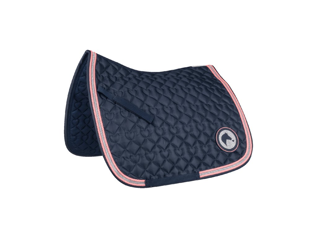 Vysoce kvalitní sedlová podložka se srdíčkovým prošíváním a stříbrnou třpytivou šňůrkou. Podložka sedla je doplněna roztomilým třpytivým dětským motivem. Výplň 200 g/m² a 10 mm speciální pěny zajišťují optimální vyrovnání tlaku a tlumení nárazů. vnější materiál: 100% polyester, podšívka: 100% polyester, výplň: 100% polyester, pěna: 100% polyuretan.
