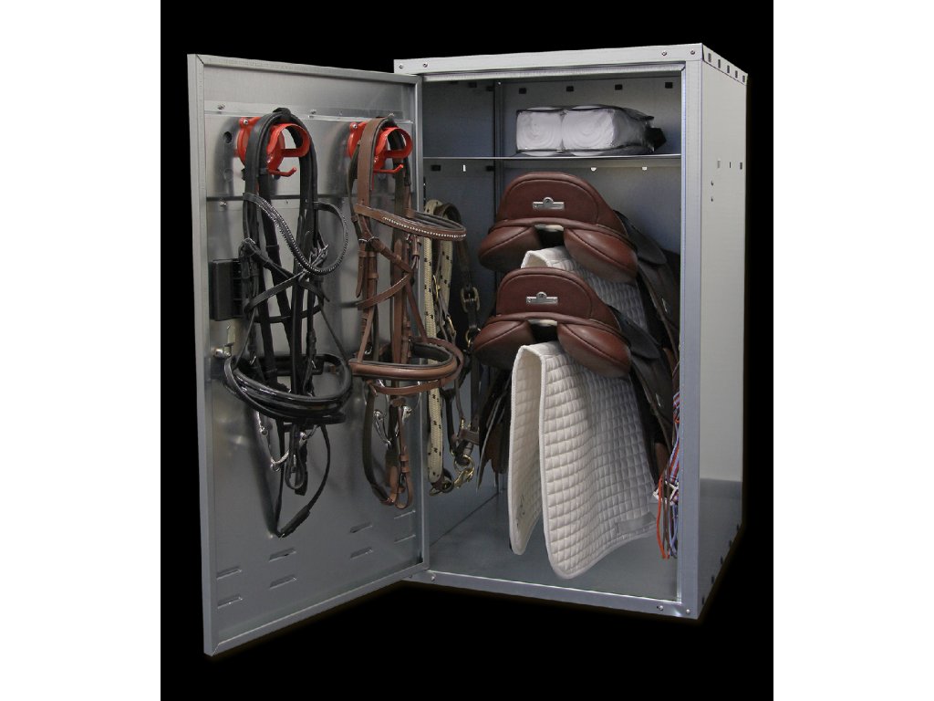Malá sedlová skříň je praktickým řešením pro bezpečné a přehledné uložení jezdeckého vybavení. Díky přehlednému vnitřnímu uspořádání poskytuje prostor pro dvě sedla, dva podbřišníky, uzdečky a další drobnosti, které lze zavěsit na háčky. Skříň je dodávána v demontovaném stavu, montáž je snadná díky přiloženému návodu. Konstrukce z pozinkovaného plechu zajišťuje dlouhou životnost. Vhodné pro přepravu i do menších stájí.