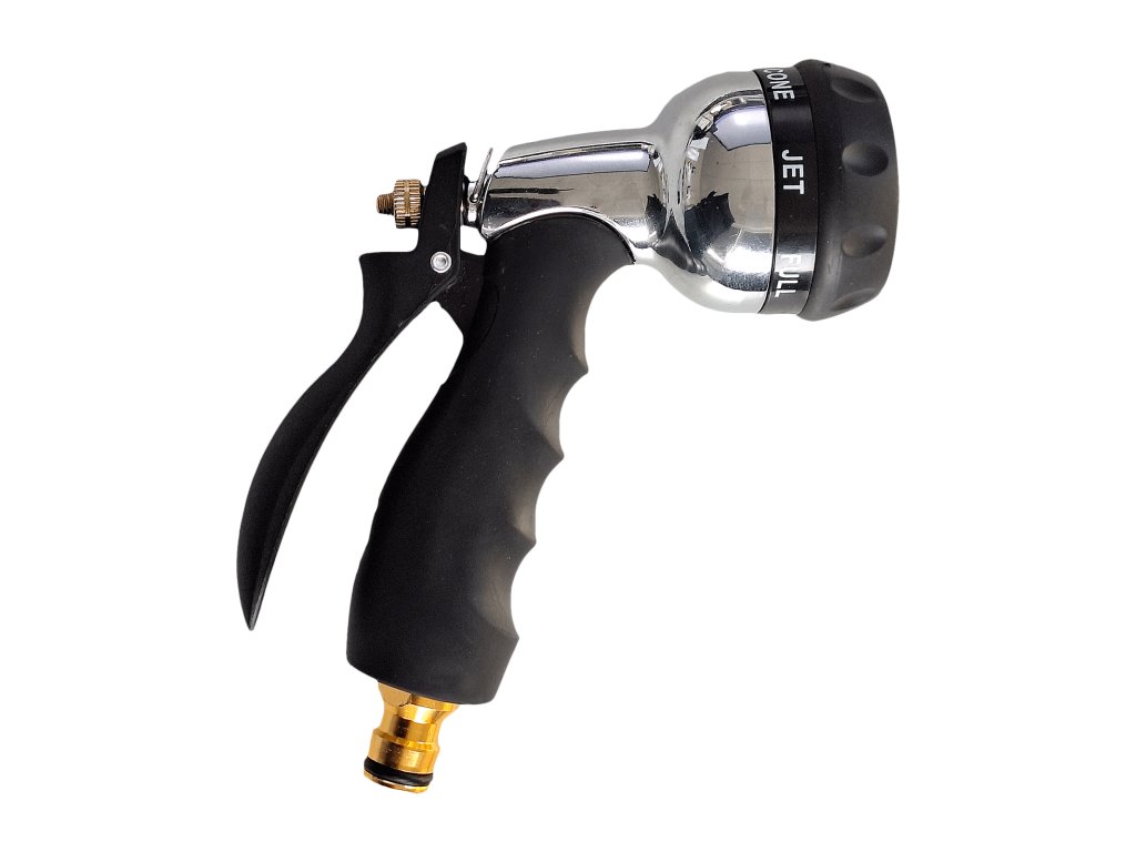 Tato sprchovací hlavice je vyrobena z kvalitního plastu, mosazi a kovu, což zajišťuje dlouhou životnost i v náročných podmínkách. Disponuje sedmi typy postřiku – od jemného mlžení až po silný proud – a plynule nastavitelným množstvím vody pomocí otočného knoflíku. Permanentní zámek umožňuje dlouhodobé použití bez nutnosti držení spouště. Snadno se ovládá jednou rukou a měkký plastový kroužek chrání hadici i hlavici před poškozením. Díky zásuvné spojce je kompatibilní se standardními click‑on systémy, což usnadňuje montáž a demontáž.
