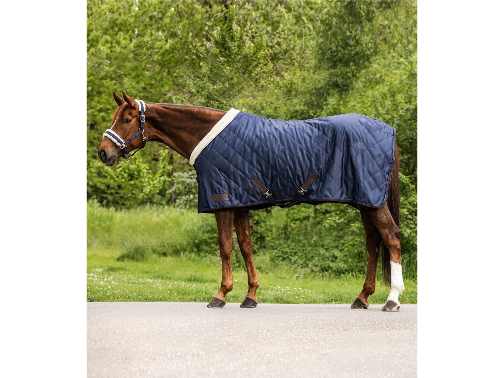 Stájová a přepravní deka Exclusive v elegantní půlnoční modré barvě je vybavena měkkou podšívkou z umělé králičí kožešiny, která efektivně zadržuje tělesné teplo a zároveň je velmi příjemná na dotek. Deka má lehkou výplň 50 g a doplňuje ji límec z umělé kožešiny pro větší pohodlí. Díky nastavitelným a odnímatelným křížovým popruhům, dvojitému zapínání ve tvaru T a kovovým okům pro upevnění ocasního popruhu deka skvěle sedí a drží na svém místě. Vhodná pro pobyt ve stáji i bezpečné cestování.