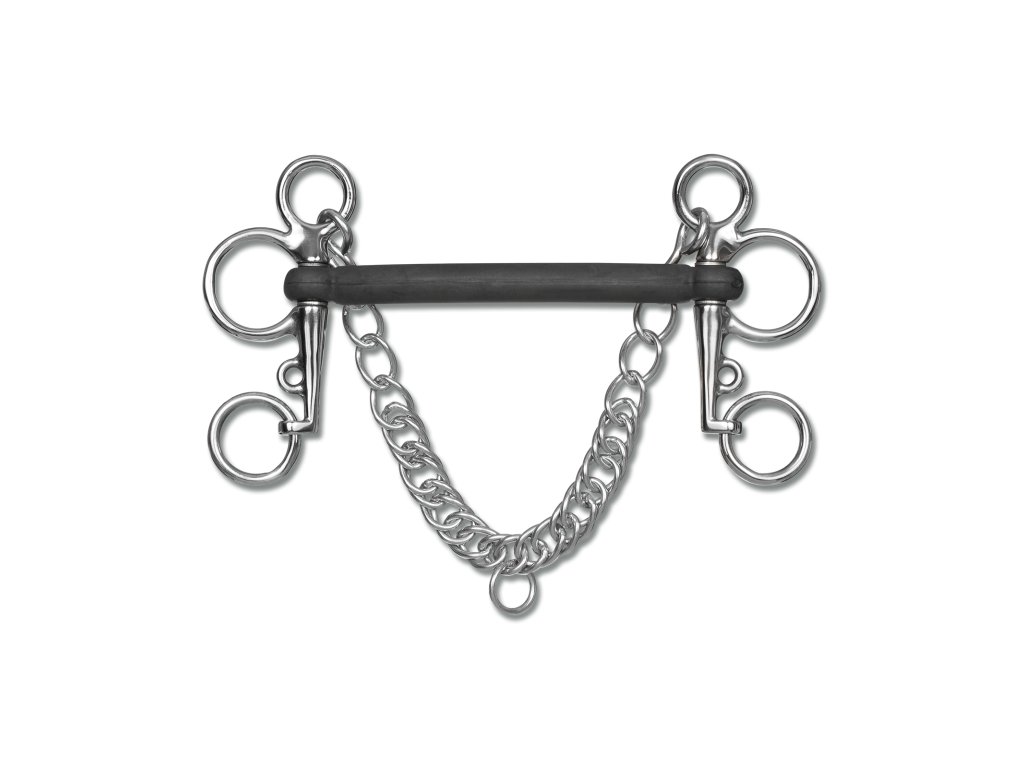Toto nelomené udídlo typu Pelham od značky Waldhausen je vyrobeno z termoplastického polyuretanu bezpečného pro potraviny, a je tak šetrné k citlivé hubě koně a poskytuje jemné, ale účinné působení. Součástí je i podbradní řetízek. Horní armeno má délku 4 cm, spodní 5 cm, tloušťka náustku činí 15 mm.