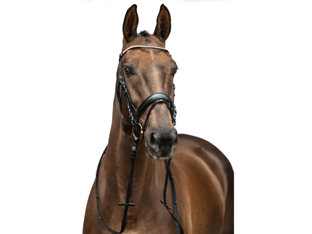 Uzdečka KOPENHAGEN od značky HKM je navržena tak, aby zajistila maximální komfort pro koně a zároveň reprezentativní vzhled. Vyrobena z kvalitní kůže s měkkým podložením, chrání proti otlakům a zajišťuje vysoký komfort i při delším tréninku nebo vyjížďce. Švédský nánosník s přezkou umožňuje přesné a šetrné nastavení, zatímco oboustranně nastavitelný podbradní řemínek zajišťuje optimální přizpůsobení. Uzdečka je doplněna otěžemi z tkaného materiálu s koženými dorazy, které poskytují pevný úchop a skvělou kontrolu. Čelenka s kontrastními ozdobnými kamínky je snadno odnímatelná díky praktickému zapínání na druk, což umožňuje jednoduchou údržbu i změnu stylu.