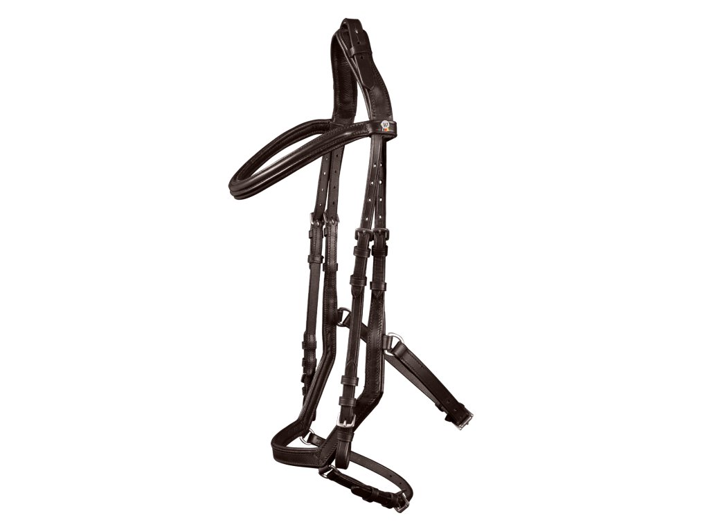 cévy a kostní oblasti na nosním hřbetu a lícní kosti - Přídavný ganzový řemínek pro zmírnění tlaku na spodní čelist - Nátylník s dodatečnou vůlí v uších a otvorem uprostřed, aby se zabránilo tlaku na zánártní vaz - Nátylník a nánosník s měkkou podšívkou - Kování z nerezové oceli - 19 mm pásové otěže