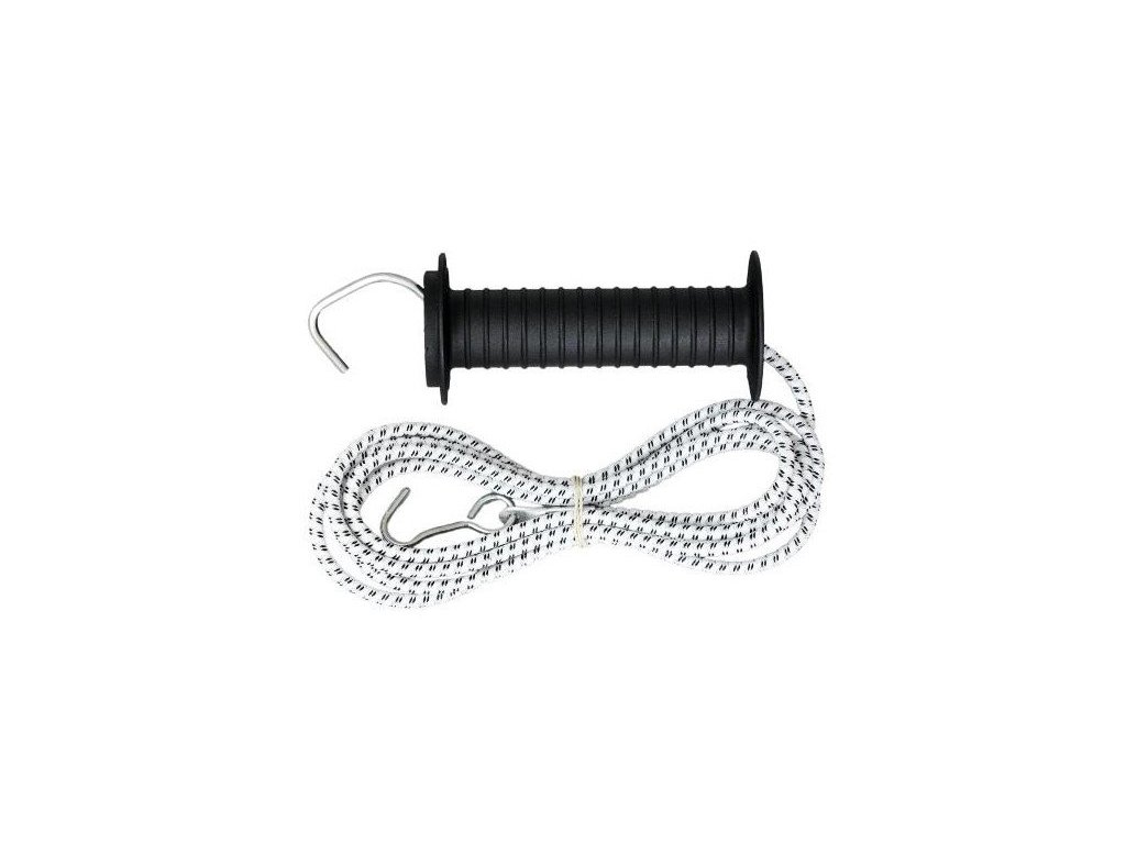 Tento praktický set pro vchod do ohrady obsahuje pevnou izolační rukojeť a gumové lano s integrovaným nerezovým vodičem. Lano lze snadno natáhnout od 4 do 7 metrů, což umožňuje pohodlný průchod lidí či zvířat, aniž by došlo k narušení funkce elektrického ohradníku. Díky odolnému provedení je set vhodný pro dlouhodobé venkovní použití a spolehlivě zajistí bezpečné uzavření vstupu.