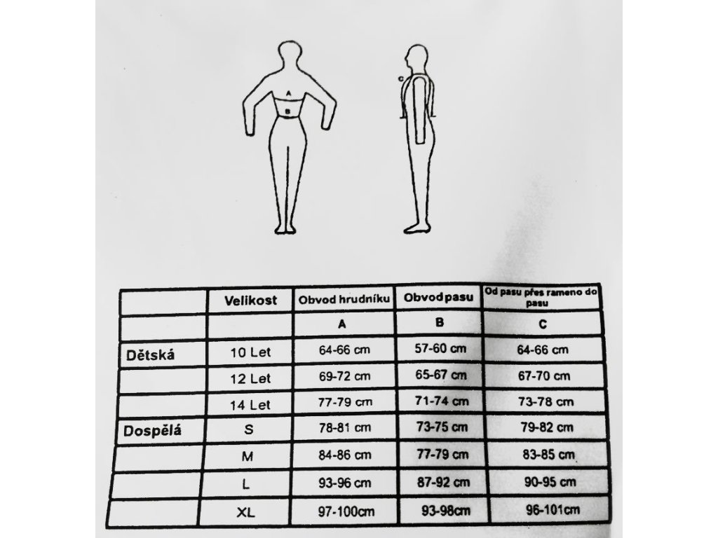 Vesta se zapíná vpředu na zip, nastavení na ramenou a pomocí suchých zipů a na bocích pomocí šňůrek.