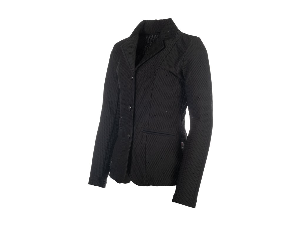 - The competition jacket Crystal Kids combines elegance and functionality so that even the little ones can make a big impression at competitions. The breathable material made of lightweight mesh ensures a comfortable fit even in warmer temperatures, while the tailored cut and integrated riding slits offer optimum freedom of movement. The concealed zip behind the button placket and the trim with fine rhinestones give the jacket an elegant touch. The material is crease-resistant and elasticated and therefore adapts perfectly to the shape of the body.